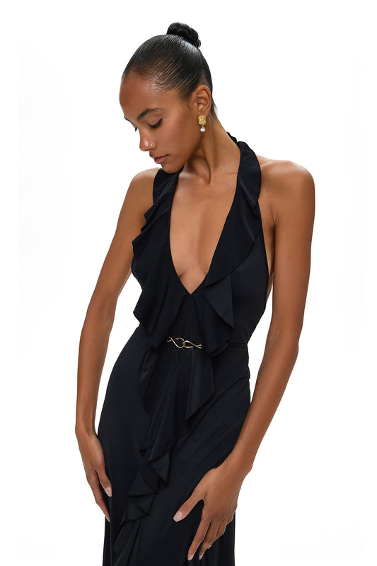 MAXI JERSEY DRESS WITH DEEP RUFFLES NECKLINE AND THIN BELT WITH METAL HOOKS DECOR BLACK