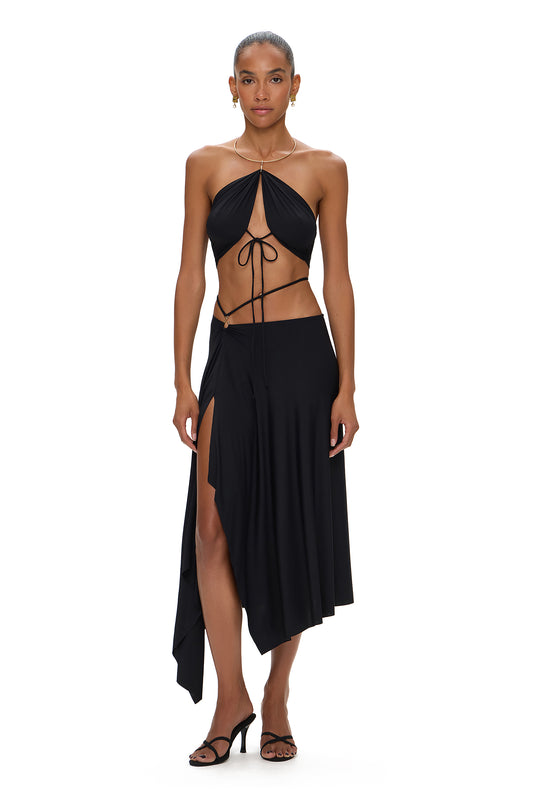 LYCRA SUIT TOP WITH METALLIC CHOKER AND ASYMMETRICAL SKIRT WITH HOOK BLACK