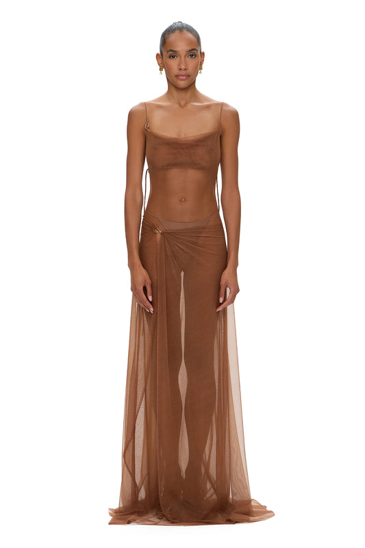 MESH MAXI DRESS AND SKIRT WITH METAL FISHING HOOK DECOR CHOCOLATE