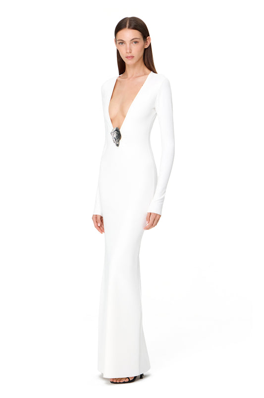 LYCRA LONG SLEEVE MAXI DRESS DEEP NECKLINE WITH METAL SHELL DECOR WHITE