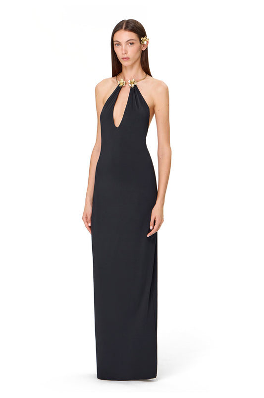 LYCRA MAXI DRESS WITH METAL FRANGIPANI CHOCKER BLACK