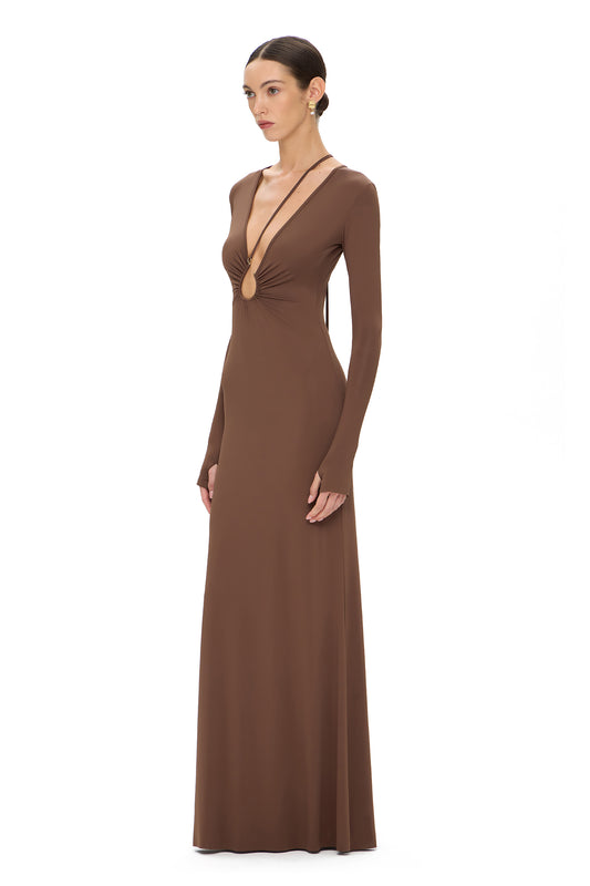 LYCRA LONG SLEEVE MAXI DRESS DEEP NECKLINE WITH METAL FISHER HOOK DECOR CHOCOLATE