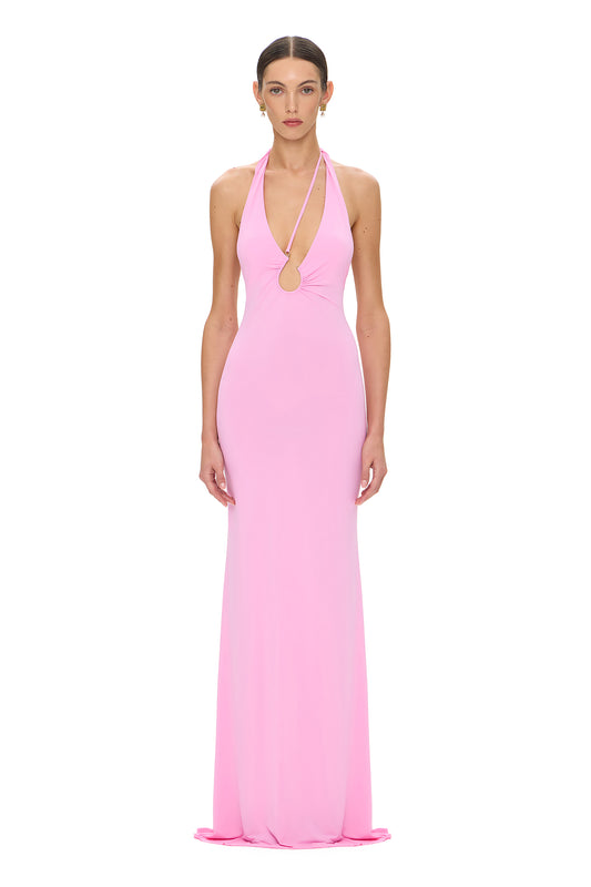 LYCRA MAXI DRESS OPEN SHOULDERS DEEP NECKLINE AND FISHING HOOK PINK