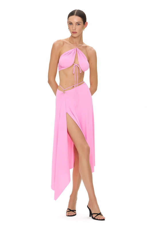 LYCRA SUIT TOP WITH METALLIC CHOKER AND ASYMMETRICAL SKIRT WITH HOOK PINK