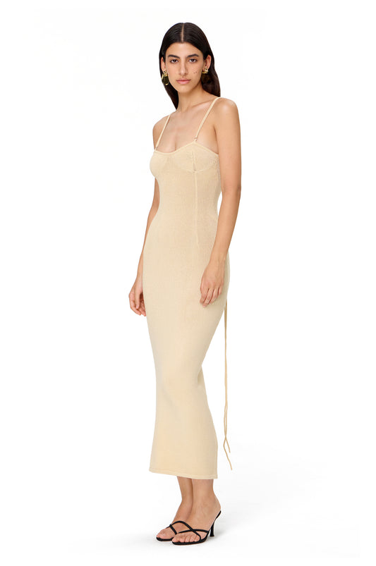 KNITTED MAXI THIN STRAPS DRESS WITH BACK SLIT LUREX GOLD