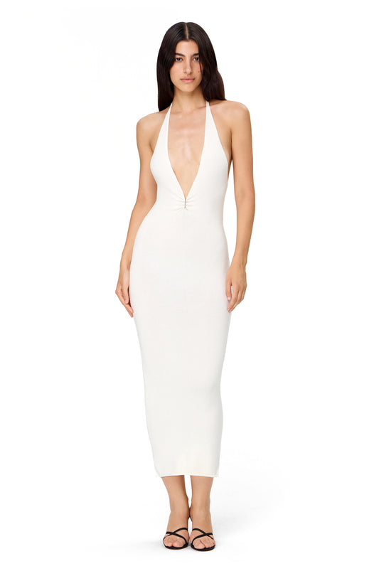 KNITTED MAXI DRESS WITH DEEP NECKLINE OPEN BACK WHITE
