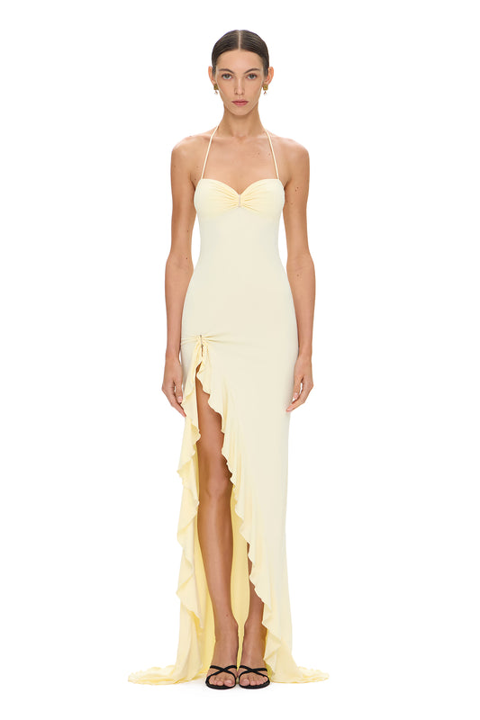 LYCRA OPEN SHOULDERS DRESS WITH STRAPS AND HIGH FRILL SLIT YELLOW