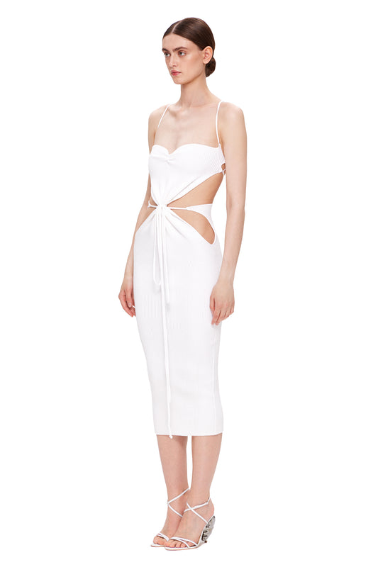 KNITTED STRAPPY MINI DRESS WITH PLEATS AT THE BOTTOM AND SMALL HOOKS DECOR WHITE