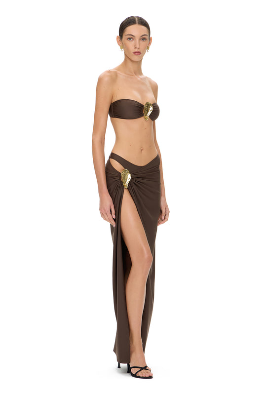 LYCRA LONG SKIRT WITH HIGH SLIT AND METAL SHELL DECOR CHOCOLATE