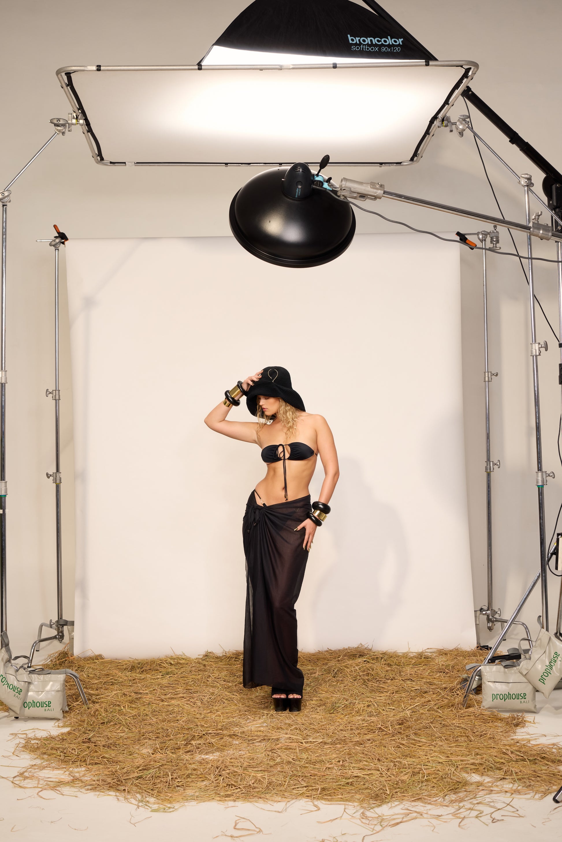 The look is styled with a hat and statement bracelets. These accessories are available for purchase in our ACCESSORIES section.