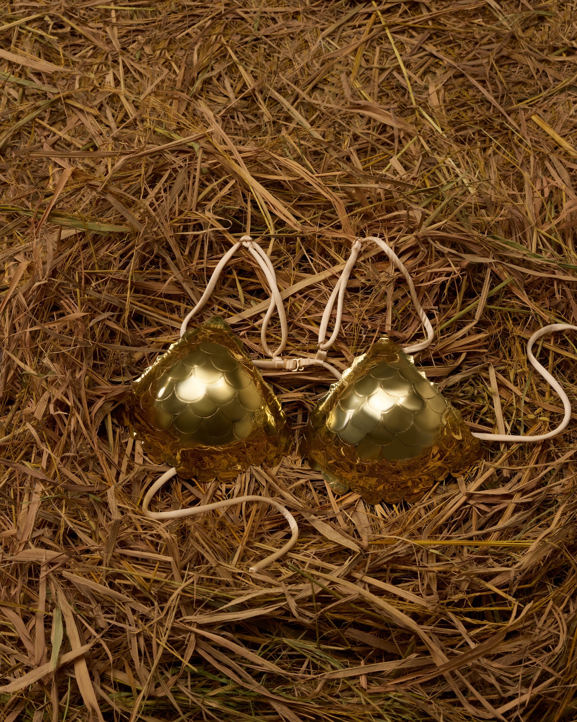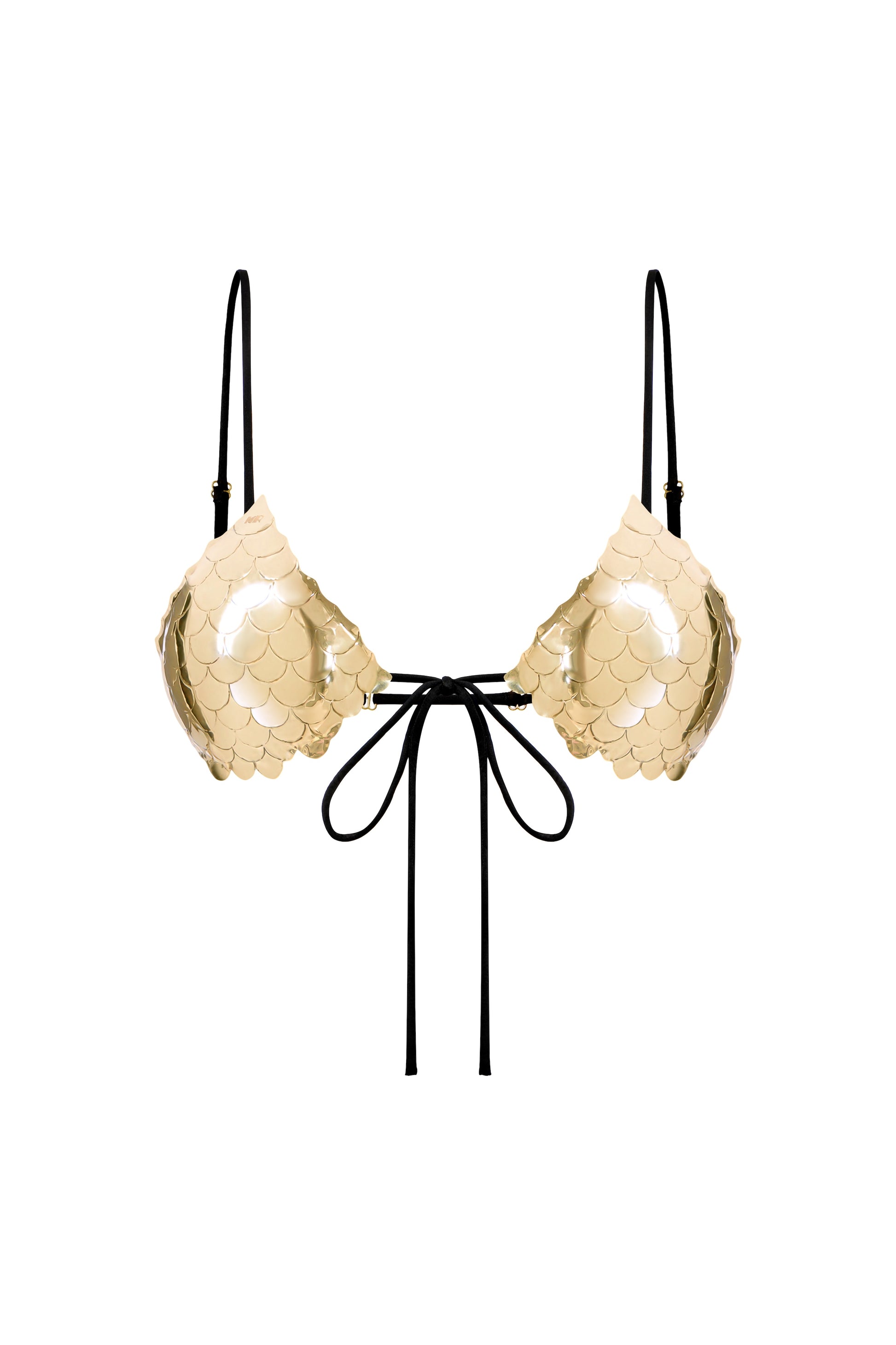 The cups are formed from finely finished metal elements with a soft gold-toned sheen, contouring the body to create a sculptural and expressive silhouette. Adjustable ties allow for a customizable fit while accentuating the décolleté.