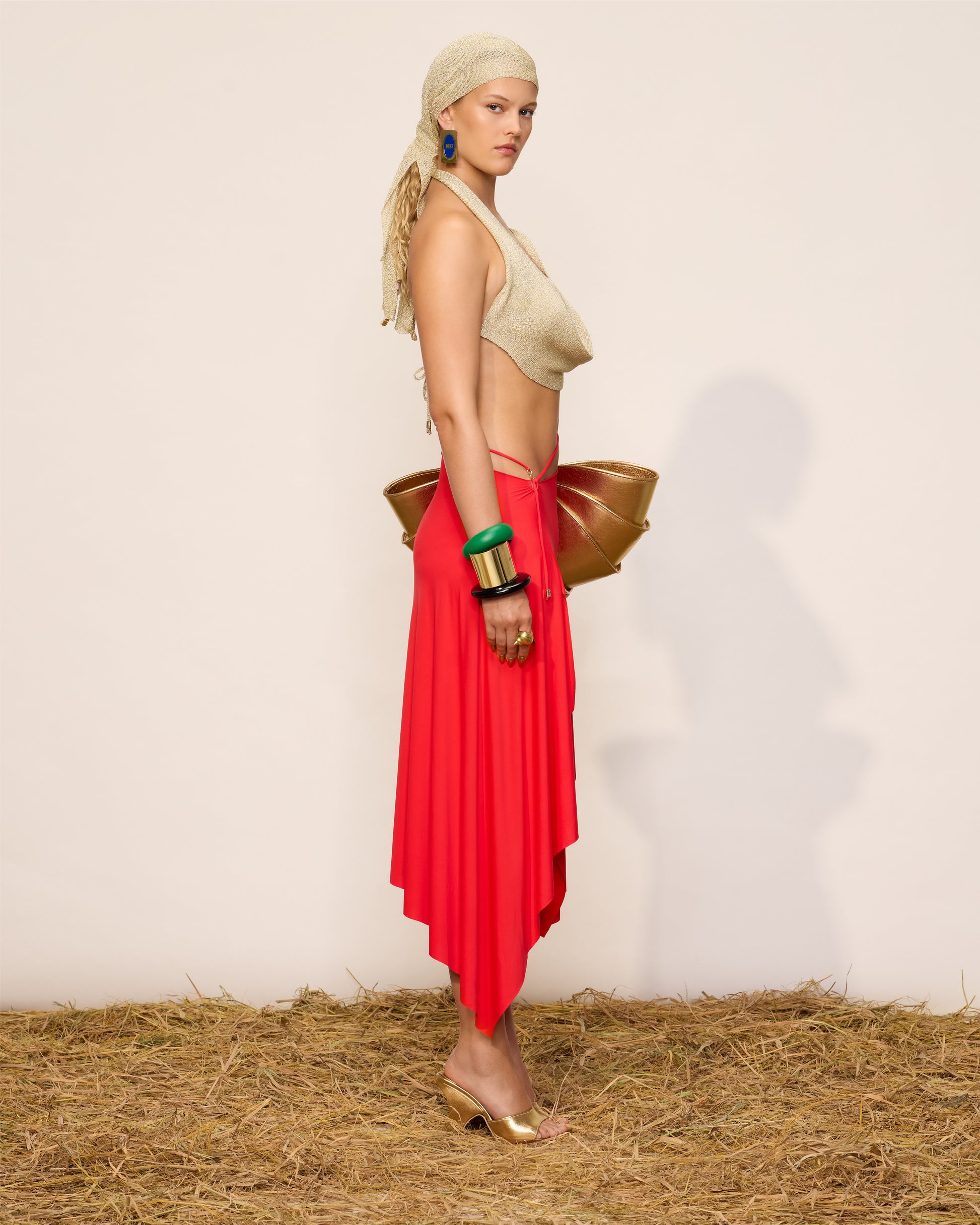 - A top crafted from fine knit fabric with a subtle shimmering finish in a refined gold tone. The lightweight, fluid material drapes softly, creating a sense of movement and enhancing the décolleté. The design features a deep draped neckline and an open back with a halterneck tie, shaping an elegant and sensual silhouette. A large decorative gold hook at the strap serves as a signature design element, adding a jewelry-like accent and defining the character of the piece.